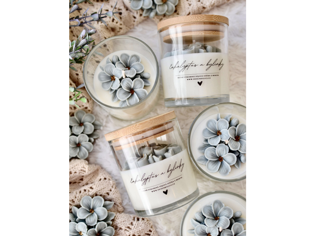 100% přírodní sójová svíčka s vůní eukalyptu, levandule, máty a citrónové trávy