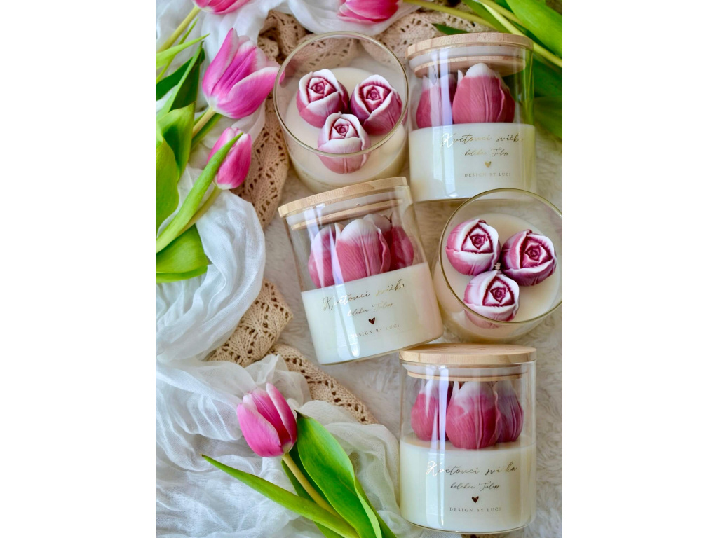Vytvořila jsem pro vás kolekci kvetoucích svíček, které dodají interiéru jemnou eleganci a svěží nádech rozkvetlé přírody. Každou svíčku zdobím třemi rozkvetlými tulipánky z vosku a svíčkám jsem vybrala kombinci vůní inspirované rozkvetlými zahradami a sady a slaďoučkým sluncem prohřátým ovocem. Všechny mé svíčky vyrábím ručně s láskou, pečlivostí a v souladu s přírodou.