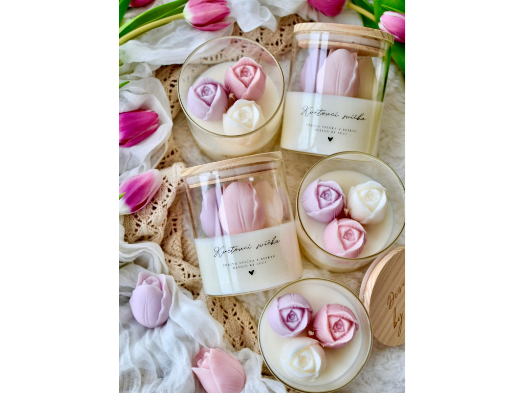 Vytvořila jsem pro vás kolekci kvetoucích svíček, které dodají interiéru jemnou eleganci a svěží nádech rozkvetlé přírody. Každou svíčku zdobím třemi rozkvetlými tulipánky z vosku a svíčkám jsem vybrala kombinci vůní inspirované rozkvetlými zahradami a sady a slaďoučkým sluncem prohřátým ovocem. Všechny mé svíčky vyrábím ručně s láskou, pečlivostí a v souladu s přírodou.